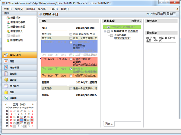 EssentialPIM Pro(个人信息管理软件)中文免费版是一款十分好用的个人信息管理软件。EssentialPIM Pro(个人信息管理软件)中文免费版可以帮助用户快速的安排各类待办事项,以鲜明的色差提醒用户待办事项。有需要的小伙伴快来下载使用吧!