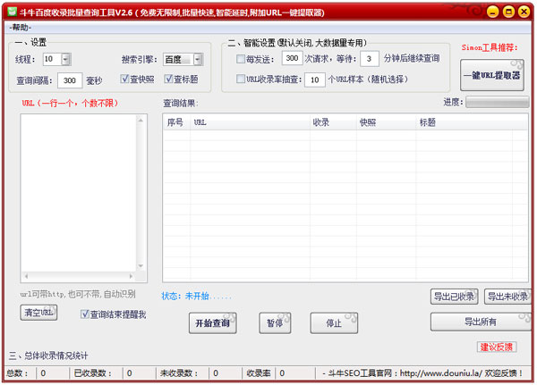 斗牛百度收录批量查询工具是一款绿色免费的百度收录查询小工具。该款百度收录批量查询软件界面简洁、操作简单,能批量快速的进行收录查询操作,同时支持免费无限制、批量快速、智能延时、附加URL一键提取器的功能,让您省时高效的进行收录查询操作。