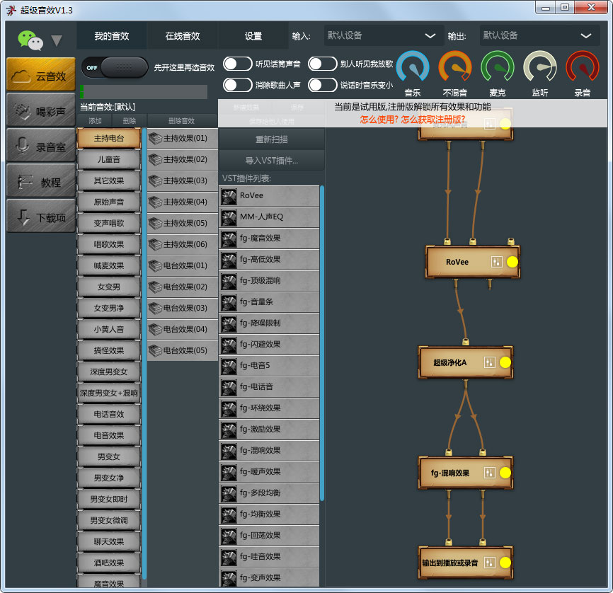 超级音效是新一代直播K歌游戏变音神器,超级音效不仅可以变声,男变女,卡通人物声音,变各种声音,还可以用来直播K歌。