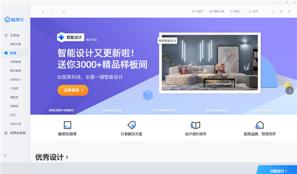 酷家乐3D云设计软件是一款用于室内设计的软件,专门为装修从业人员设计的装修设计软件。酷家乐拥有强大的户型、家具、厨房模型等等智能布局。里面内置模板丰富,即使是新手也能使用这款软件。