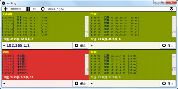 2、如果需要同时ping多个主机,可以采用添加主机的方式来获得更加直观的连接情况;