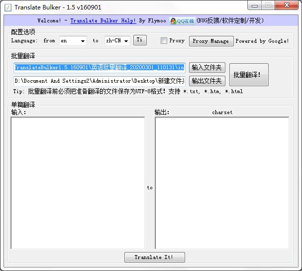 Translate Bulker绿色版是款针对语言所打造的翻译工具,支持批量翻译也支持单篇翻译,还支持多国语言互相翻译批量翻译前必须把准备翻译的文件保存为UTF-8格式,支持*.txt、*htm、*html等格式,点击批量翻译就可以读取文件内容,为用户批量翻译文件提供帮助。
