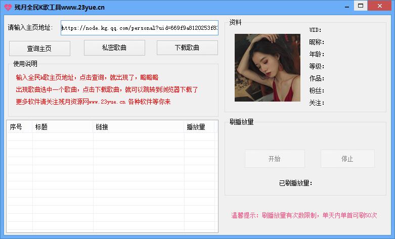 残月全民K歌工具是残月网制作的一款开源的全民K歌增加播放量和下载软件,通过残月全民k歌工具用户可以为自己喜欢的歌手刷高播放量还能轻松下载自己喜欢的歌手的歌曲和MV,喜欢玩全民K歌的用户千万不要错过了。