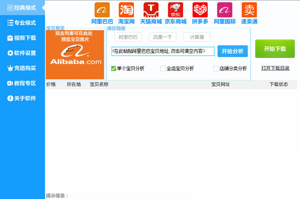 神速阿里巴巴图片下载器是专为电商朋友量身打造的一款非常强大的图片下载工具。用户使用该软件可以对阿里巴巴、淘宝网、天猫商场的产品图片进行采集下载,还可以获得宝贝相关数据,如宝贝价格,所在地,标题,链接等。