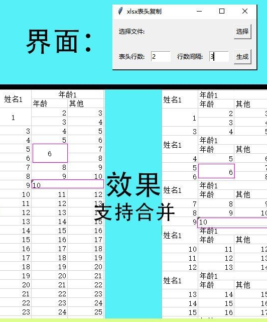 主要功能,将工作表中的前几行,每隔固定的行数插入数据中间。然后另存为新的文件,保证原文件不被修改。
