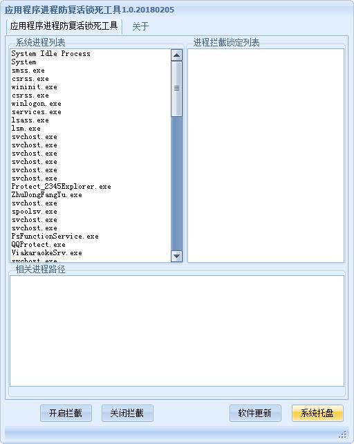 应用进程防复活锁死工具能够帮你监控系统中的一些恶意应用程序进程,往往是广告程序,自动程序安装器等,这类进程都会在你关闭之后又自动强制开启,防不胜防,但是你可以利用这个工具来锁定这些进程,永不开启,操作简单,使用便捷,非常不错。