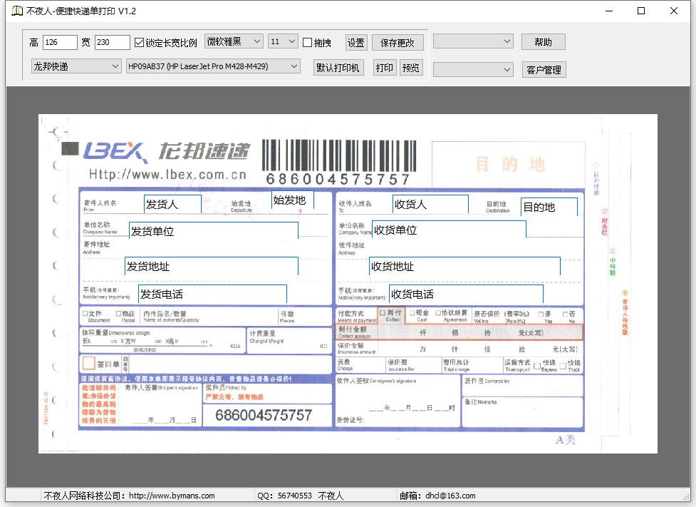 不夜人便捷快递单打印是一款免费的快递单打印系统,适宜于一切发货单位使用,可以直接输入发、收货单位信息。也可以事先输入数据库,发货时直接调用,发、收货单位信息是保存在本地数据库中,便于用户管理客户信息。