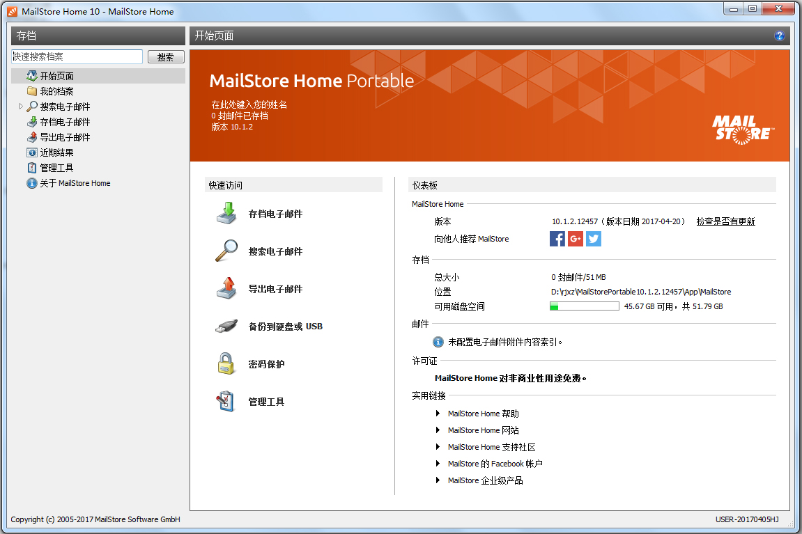 MailStore Home也可作为一个“便携”选项,不必提前安装在任何电脑上也能通过一个USB硬盘驱动来启动它。如果您希望选择使用一个USB闪存驱动器的话,请选择使用高品质设备。