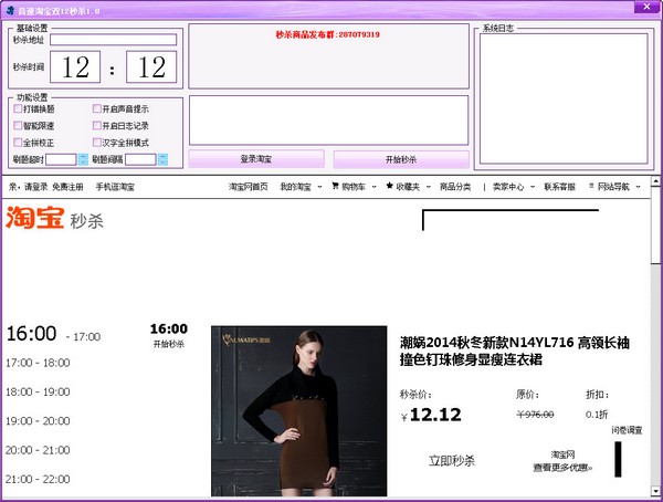 音速淘宝双12秒杀是专门为双12秒杀活动制作的一款秒杀工具。旨在帮助广大用户提高秒杀成功率,神器在手,秒杀我有!
