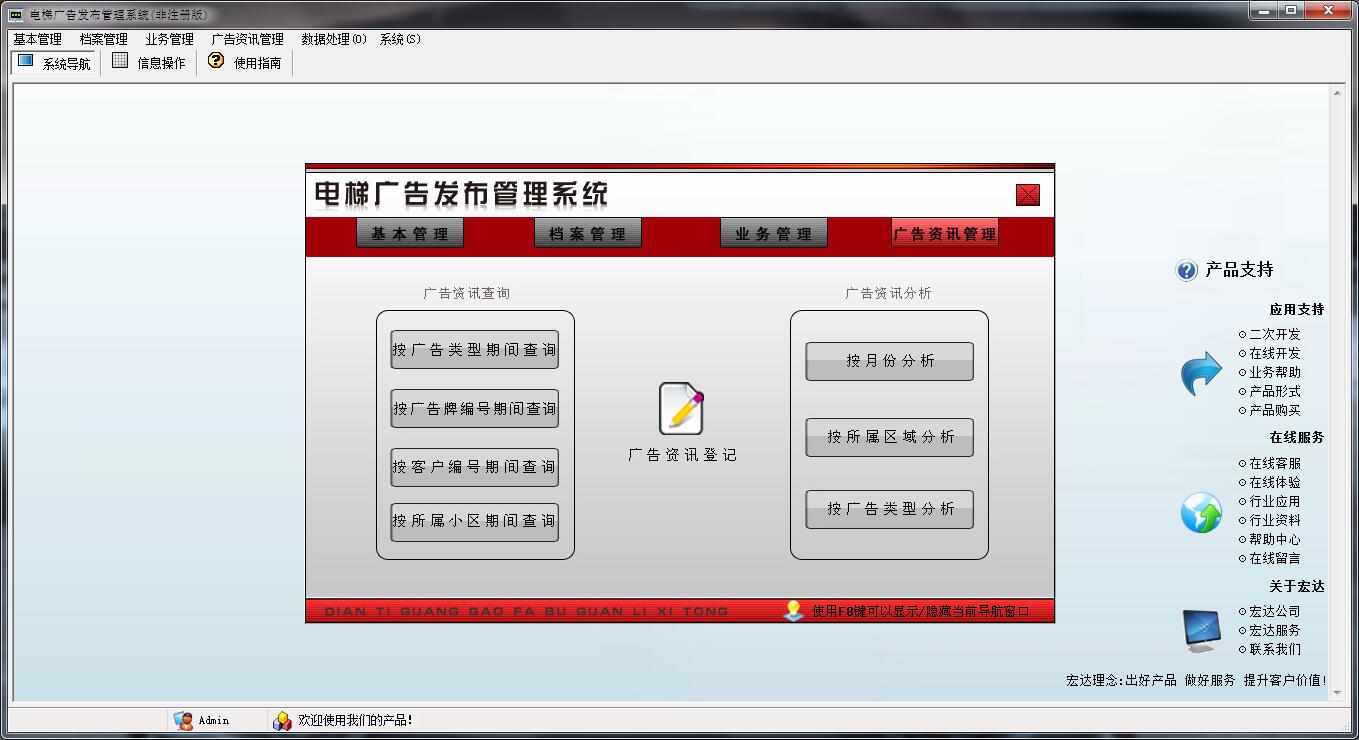 宏达电梯广告发布管理系统是一款功能强大,专业实用的广告发布管理软件,软件针对电梯广告开放。适用于各电梯广告公司、广告公司等。拥有基本管理、档案管理、业务管理、广告资讯管理等功能。