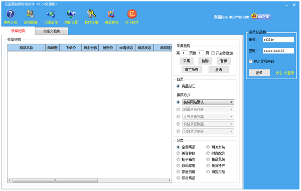 亿品赞抢购秒杀软件是一款适用于亿品赞购物网站的,可以支持自定义抢购商品分类以及排序等功能,使用也非常简单、人性化,是您亿品赞秒杀必备的工具,也是目前市面上占有率非常高的秒杀软件。