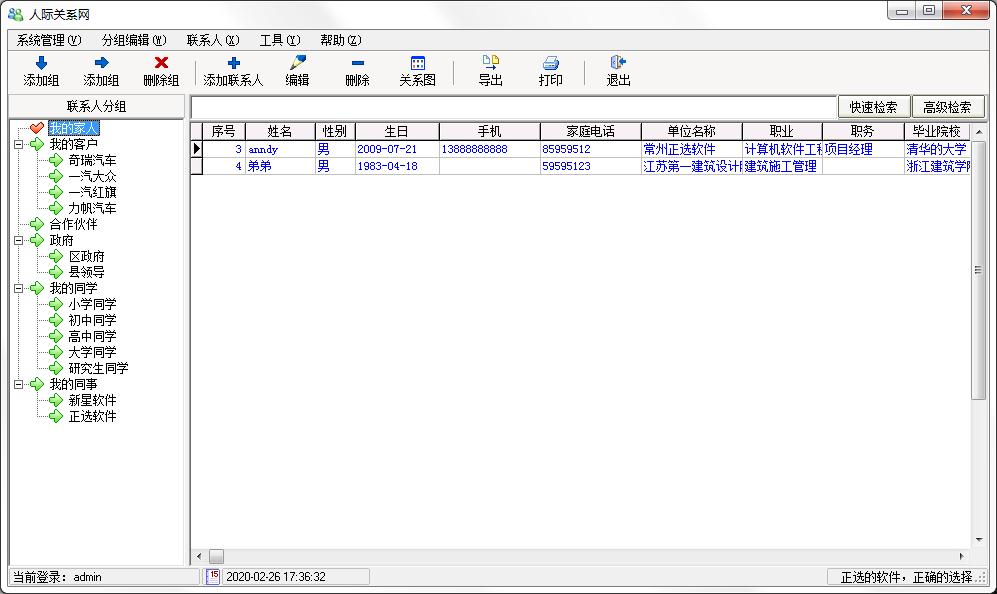 人际关系网是一款操作简单好用的人际关系管理软件,关系具有惊人的,灵活的和有吸引力的一个窗口用户管理界面,此应用程序是非常易于使用,创建组的联系,您的公司,客户,朋友,生意伙伴,等等,智能组将让您的联系更加有组织。使用任何标准来创建一个智能组。