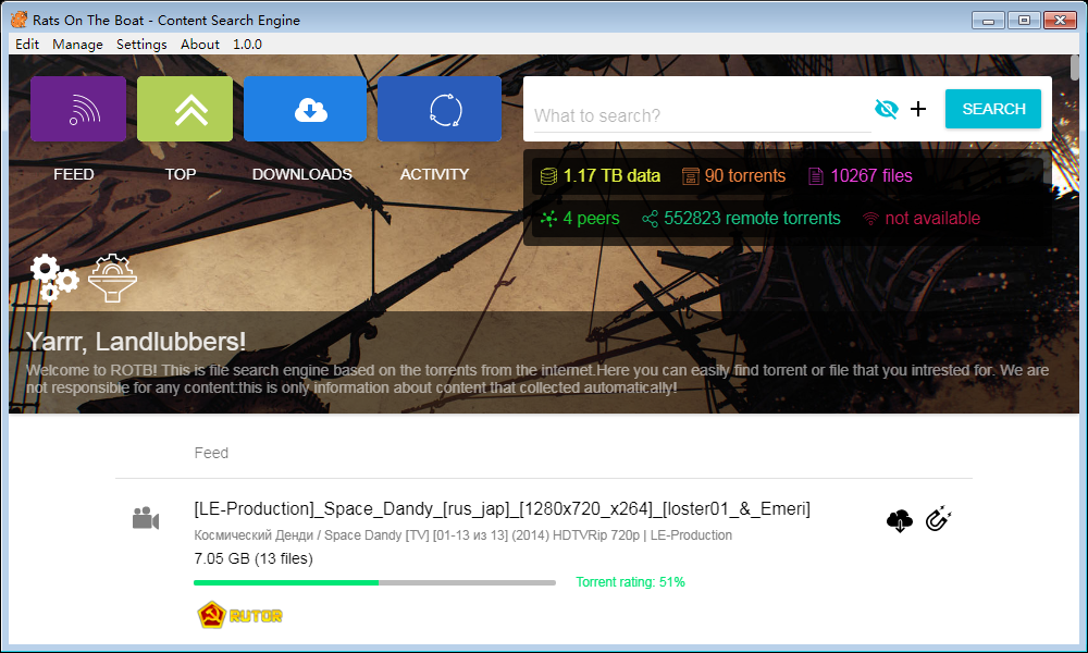 Rats on The Boat官方版是一款非常不错的软件,Rats on The Boat官方版界面友好,功能强劲,自带搜索引擎,不需要任何tracker服务器的工具,支持种子搜索,内置了一个下载器,使用起来简单便捷。