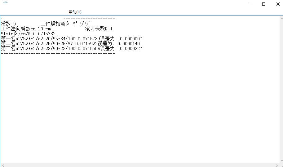 滚齿机挂轮齿数计算软件官方版用于滚齿机的挂轮计算,是免费软件。只要输入常数、工件螺旋角β、工件法向模数mn和滚刀头数K,再点下面的公式按钮,就可以算出两个分数。a2、c2是分子,b2、d2是分母。a2、b2、c2和d2都是挂轮齿数。