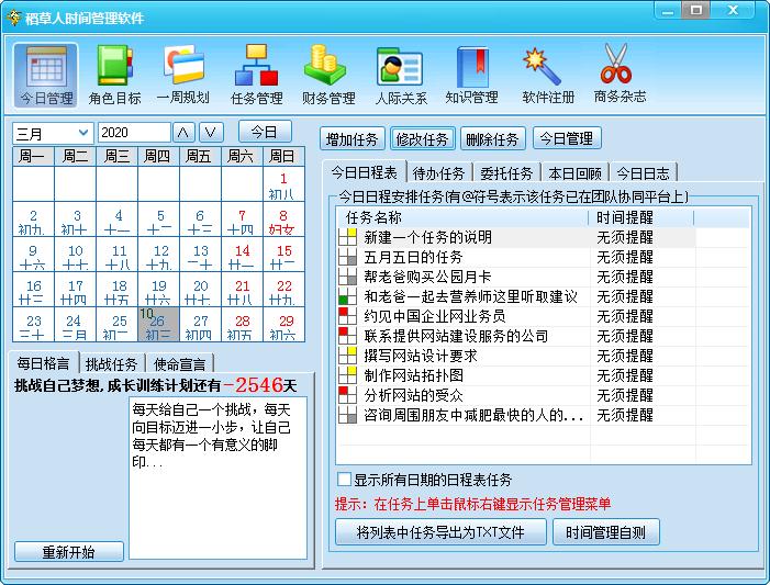 稻草人时间管理软件是款针对时间所打造的时间管理工具,可以帮助用户管理自己的时间,财务、人家关系等,还拥有事业规划、时间管理、财务管理和人际管理等功能,用户可以通过它帮您建立一个生活和事业的管理中心,以此倍增您的绩效帮您提高效率。