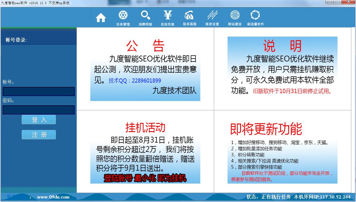 九度智能SEO优化软件是一款好用的网站SEO优化软件,这款软件支持百度、谷歌、360等各大搜索引擎,完美模拟真人点击方式,一键启动任务,后台自动点击,是网站快速提升流量的利器。