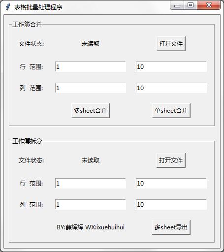 合并功能:选择多个excel文件(也就是工作簿),单sheet合并是将固定的行列数合并到一个sheet里面,多sheet合并是将固定的行列数分别拷贝到多个sheet里。