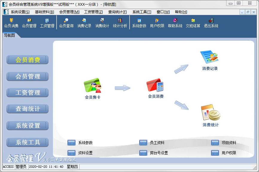 统计分析、消费记录、操作记录、消费统计、会员查询。