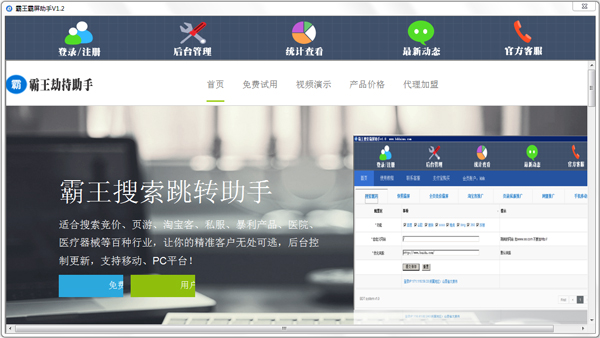 霸王霸屏助手是一款非常不错的营销软件。该软件支持各大搜索引擎,支持自定义跳转,能够有效提高转化率,让你的流量瞬间提高!