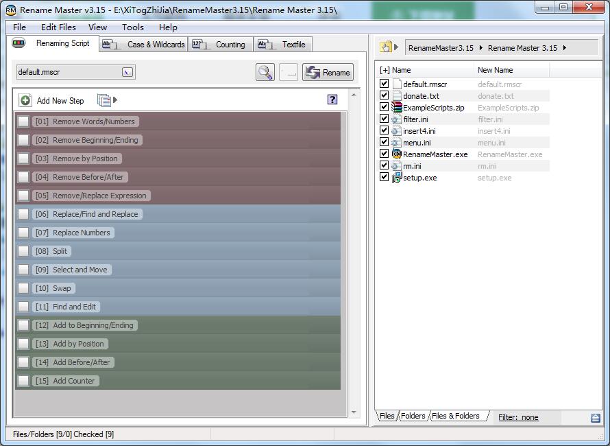 Rename Master是一款批量改名工具,可以根据 MP3 文件的 Tag Info 改名,还可以同时更改文件属性。软件界面友好,功能强大,而且支持音频,视频,图片,网页及任何文件的重命名,轻松的新增,删除,取代部分文件名,并且支持文件属性,MP3歌曲标签,JPEG/JFIF/EXIF图片文件标签的重命名。