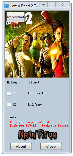 是一款同名下的游戏辅助工具。求生之路2是一款动作类游戏,玩家可以通过修改器来得到生命,弹药等,让你轻松玩游戏。