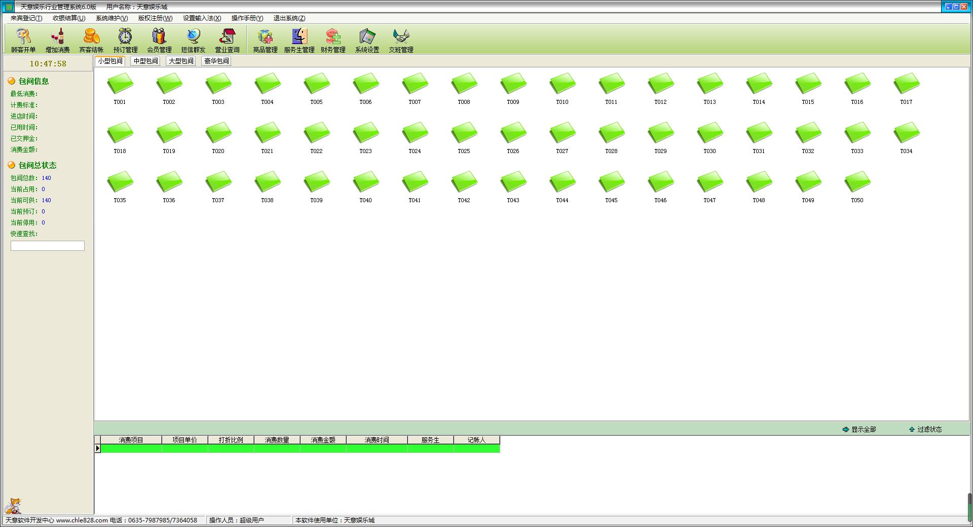 每个客户发生消费前必须进行登记(建立客户帐),给客户安排一个包厢(手牌)等包厢项目,包厢项目必须是在“系统设置”模块中的“包厢项目”中已经设置,系统只能对已设置的包厢项目(手牌)进行登记。
