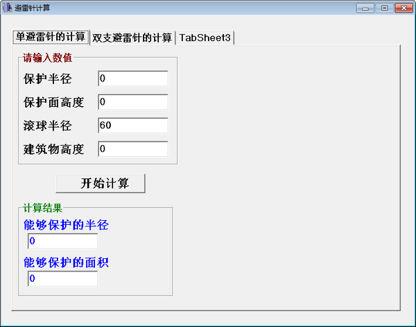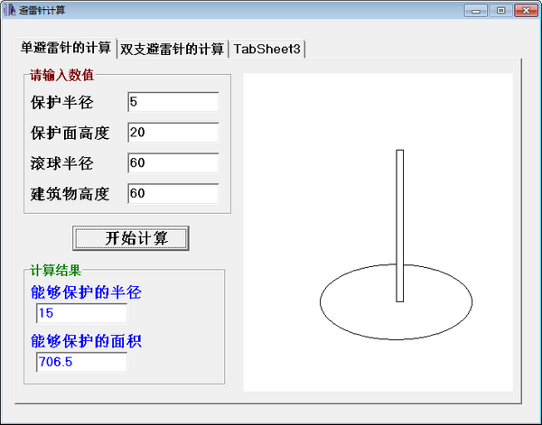 避雷针计算工具正式版可根据单个避雷针的保护半径、保护面高度、滚球半径、建筑物高度计算出能够保护的半径和能够保护的面积。