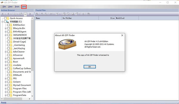 8、双击打开AX-ZIP Finder破解版软件,点击Help下的About,如下图软件破解完成,可以放心使用软件。