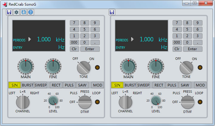 RedCrab SonoG是一款非常实用的音频发生软件,该软件为广大用户提供了两个独立发生器,有了它,我们就可以在所选频率下生成不同的波形,包括正弦波、方波、脉冲波或锯齿波等等,支持音频突发、调制、扫描和DTMF脉冲等功能。
