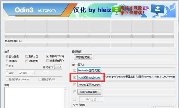 1、打开ODIN 载入刷机包,导入您提前下载好的刷机包。将手机关机,同时按住(音量下键+HOME键+电源键)5秒左右。