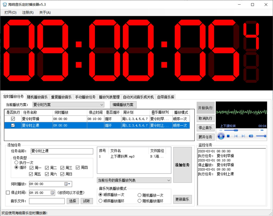 常用于学校作息时间的音乐广播提醒,比如定时播放广播体操、定时播放上下课铃声和上下学铃声、定时播放眼保健操等。也可以用于工厂、车站、公司以及公共场所定时广播等。