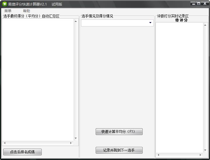 易捷评分快速计算器是一款十分专业的比赛平均分计算工具,界面简洁大方,功能强劲实用,能够轻松快捷的计算比赛的平均分,非常适用于比赛活动、竞赛活动等选手得分计算器,轻松计算平均分使用。