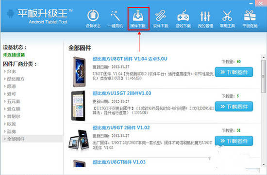 3、点击固件下载,按照平板的型号下载相应的平板固件;