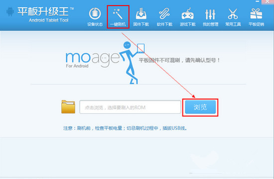 4、点击一键刷机,点击浏览,打开文件目录,找到刚才下载的固件;