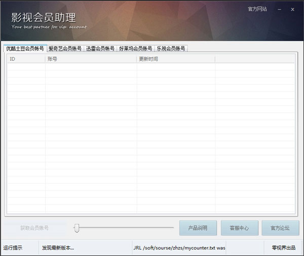 零视界影视会员助理是一款绿色好用的网络影视会员帐号获取工具,可免费获取爱奇艺、迅雷、好莱坞、乐视、优酷土豆会员帐号。有需要的朋友赶快下载吧!