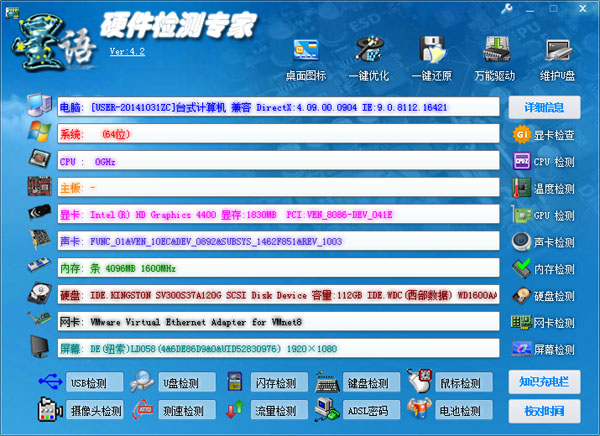 硬件检测专家可以快捷的检查和识别出硬件的详细信息,可以独立获取硬件部件和版本资料,而且能显示计算机类型和操作系统版本;再集合各大常用检测软件为一体,更深入和更简单的来查询硬件的信息。更新识别中文化硬件厂商信息;增加显卡假卡识别,新添加桌面图标快捷设置和一键优化等功能。