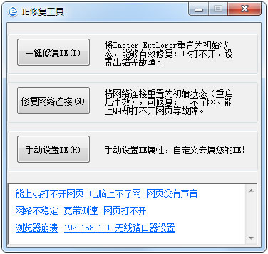 IE修复工具是一款针对IE浏览器无法打开、IE浏览器崩溃、IE首页被篡改及用户无法上网所专门研发的一款浏览器修复工具,使用本工具能够一键重置您的IE浏览器为初始状态,有效的解决了电脑无法连网,浏览器设置有误等问题,同时软件还可以将网络设置初始化,彻底解决了上不了网、打不开网页的问题。