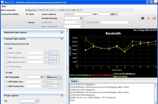 Jperf是一款图形界面的网络性能测试工具,主要功能是用来测试TCP和UDP的带宽质量,软件简化了复杂命令行参数的构造,并将测试结果以图形化的结果显示出来进行保存,可以测试一些网络设备如路由器、防火墙、交换机等的性能。