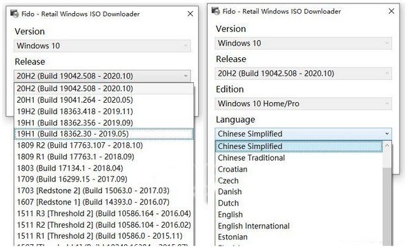 Fido是专门用来获取微软系统镜像的工具。用户可以自由选择想要下载的微软系统,软件会自动获取到镜像地址并开始下载。此外,用户还可以通过该软件自由选择版本号、语言等。软件提供的系统目前最新到WIndows 10 20H2。
