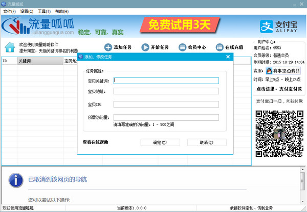 流量呱呱是一款淘宝、天猫刷流量软件,真实搜索流量,完全模拟人工输入关键词进行搜索,百分之百完全随机,不是固定互刷,完全真实流量。不同IP,不同MAC地址,确保流量信息真实有效,完全符合淘宝,天猫流量规则,后台可以统计到真实流量,避免被降权。全自动操作,用户只需要添加好任务,点击开始任务按钮,即可软件全自动运行,无需人工干预。