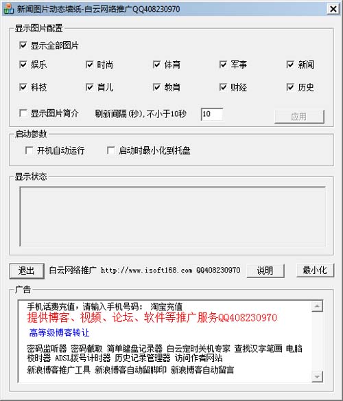 该软件使用最新发生的新闻图片做为墙纸,按一定时间动态变换,用户可以根据自己爱好选择不同的分类图片,设置变换的时间间隔自动动态变换墙纸。