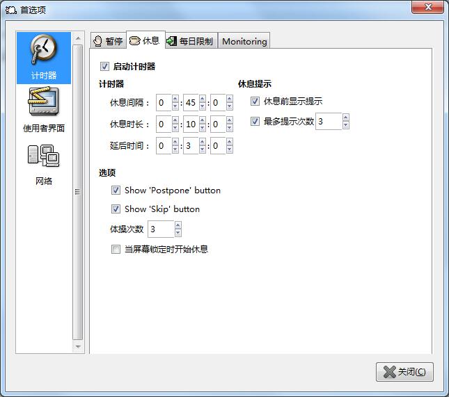 这个软件比前两者的体积要大,因而功能也多,比如眼睛保健操的动画导引非常有趣实用。但这个软件强制力不是很高,允许你忽略锁屏,自制力较好的人可以使用,反之恐怕就没有多少效果了。