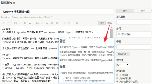 预览选项,可以查看渲染后的文章效果。图片可以通过 “附件” 上传,并在文章中引用,或者使用图床。