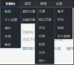 进入网站后台,控制台、撰写、管理、设置,四个大选项简单明了。