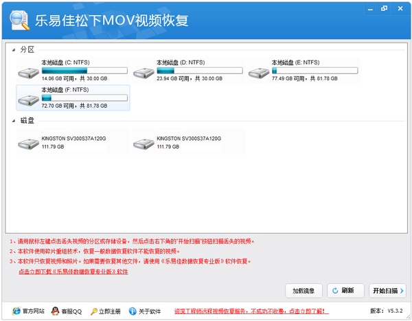 乐易佳松下MOV视频恢复能够专业恢复松下EOS全系列单反相机拍摄的MOV格式视频,它操作简单,只需三部就能快速恢复,恢复出来的文件可以正常播放或编辑。