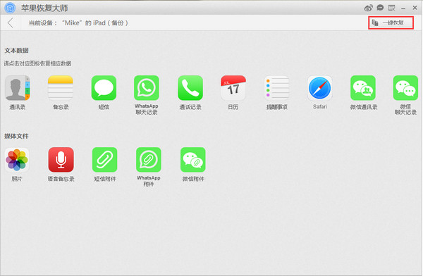 苹果恢复大师是一款功能强大而且免费的苹果设备数据恢复软件,通过苹果恢复大师你只需一键即可找回联系人,短信和照片等多达15种数据类型,是最顶尖的数据恢复软件。苹果恢复大师可恢复使用iOS 5/6/7/8系统的iOS设备近15种类型数据。