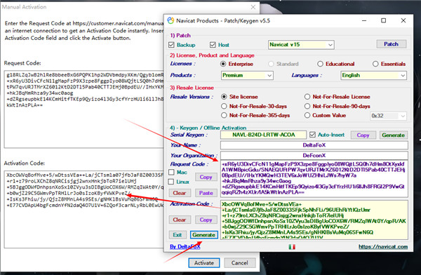 5、下一个界面里会有一大段的”请求码“,复制下来粘贴到注册机里,并点击最下方的”Generate“按钮,会生成注册码,复制回去激活即可。