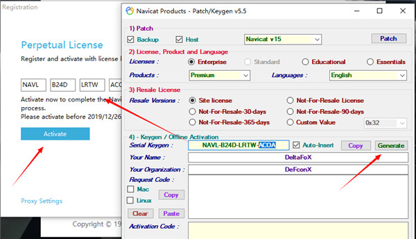 3、现在运行Navicat ,会弹出窗口提示你,还能试用14天,这时候点“注册”。点了之后会出来一个让你输入激活码的窗口。回到注册机窗口,点“ Generate”,(如下图)激活码那地方会自动填上。(如果没自动填上就手动复制一下)。然后点“激活”。