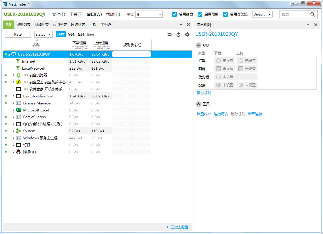 Netlimiter是一款强大的流量监控软件,使用这款Netlimiter汉化版让你操作的时候一览无遗所有功能的特色和便捷管理您希望的内容,马上下载这款Netlimiter汉化版使用吧。