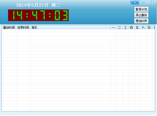 超级易用打铃系统是一款简单易用安全的打铃软件系统。只要你稍微熟悉windows,就会使用本软件。本软件可以设置每个星期周期性的铃声,可以设置播放时间和停止时间,也可以播放音乐文件夹,播放文件夹音乐时还可以随机播放歌曲,让播放的歌曲不在枯燥。同时,你也可以自由下载自己的音乐铃声、播放歌曲。
